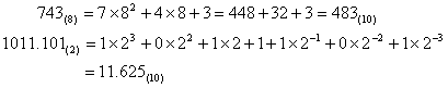 3°  pq转换  通常情况下其步骤是:a(p)a(10)a(q).如果p,q是同一数s的不同次幂,其步骤是:a(p)a(s)a(q).例如,8进数127.653(8)转换为16进数时,由于8=2316=24,所以s=2,其步骤是:首先把8进数的每个数字根据8-2转换表转换为2进数(三位一组)
