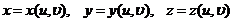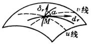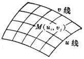 对于参数式或矢量式表示的曲面,如果取为一系列数值L,而让u连续变动,则r(u,)(i=1,2,L)表示一族曲线,称为u线(图7.23);同样,如果取u为一系列数值u1,u2,L,而让连续变动,则r(ui,)(i=1,2,L)表示另一族连续曲线,称为线.u线与线在曲面上构成曲线网,称为坐标线或坐标网.于是u=ui, =这个数对就可以确定曲面上一点M,这数对(ui,)称为点M的曲线坐标(或高斯坐标).