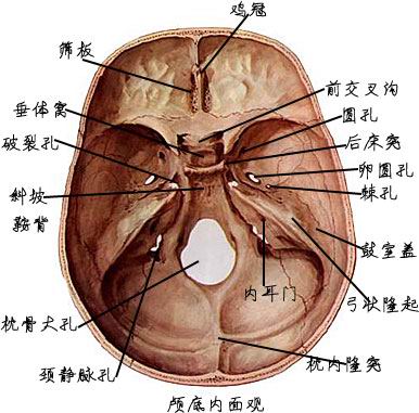 颅底内面凹凸不平,由前向后依次为颅前窝、颅中窝、颅后窝。 Skull inner surface is uneven, from front to back followed by the anterior cranial fossa, middle cranial fossa, posterior fossa.
