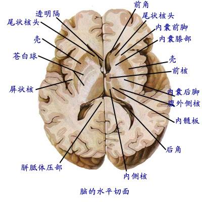 内囊:位于背侧丘脑、尾状核、豆状核之间,由上行的感觉纤维和下行的运动纤维构成。 Internal capsule: Located between the dorsal thalamus, caudate nucleus, putamen, sensory fibers from the upstream and downstream movement of fibers. 在脑的水平切面上呈“><”状,分为内囊前肢、内囊膝、内囊后肢三部。 Was in the horizontal section of the brain "> <" shape, divided into anterior limb, knee internal capsule, internal capsule three hind legs.