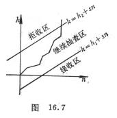 把整个平面划成三个区域:接收区,拒收区和继续抽查区(图16.7)。每检验一件产品后,看它是不是次品,然后在图上画一点(n , k),如果点落在接收区内,就接收这批产品;如果点落在拒收区内,就拒收这批产品;如果点落在继续抽查区,就继续抽检。经有限次抽查,点(n , k)总会跑出继续抽查区,这时便可作出接收或拒收的判断。
