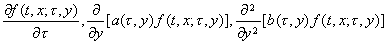 [柯尔莫哥洛夫第二方程]  如果扩散过程的条件分布函F(t,x;τ,y)具有分布密度f(t,x;τ,y),并且下面的各个偏导数