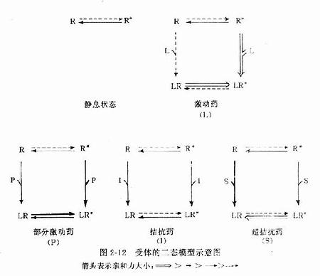 二、受体类型根据受体蛋白结构、信息传导过程、效应性质、受体位置等特点,受体大致可分为下列4类: 1. 含离子通道的受体 又称直接配体门控通道型受体,它们存在于快速反应细胞的膜上,由单一肽链反复4次穿透细胞膜形成1个亚单位,并由4~5个亚单位组成穿透细胞膜的离子通道,受体激动时离子通道开放使细胞膜去极化或超极化,引起兴奋或抑制效应。最早发现的N型乙酰胆碱受体就是由α×2、β、γ、δ5个亚单位组成的钠离子通道,在α亚单位上各有一个乙酰胆碱结合点(图2-13A)与乙酰胆碱结合后,钠离子通道开放,胞外钠离子内流、细胞膜去极化、肌肉收缩。这一过程在若干毫秒内完成(钠离子通道开放时间仅1ms)。脑中γ氨基丁酸(GABA)受体情况类似,其他如甘氨酸、谷氨酸、天门冬氨酸受体都属于这一类型。