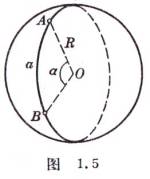 [大圆] 用一通过球心O的平面截球,在球表面所得的截线称为大圆,其半径等于球的半径R(图1.5).