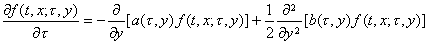 [柯尔莫哥洛夫第二方程] 如果扩散过程的条件分布函数F(t,x;τ,y)具有分布密度f(t,x;τ,y),并且下面的各个偏导数
